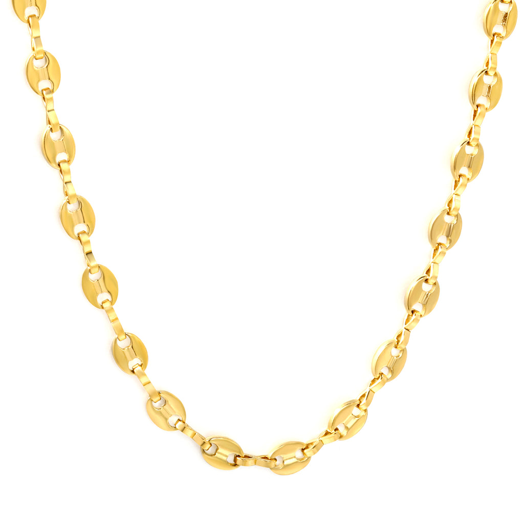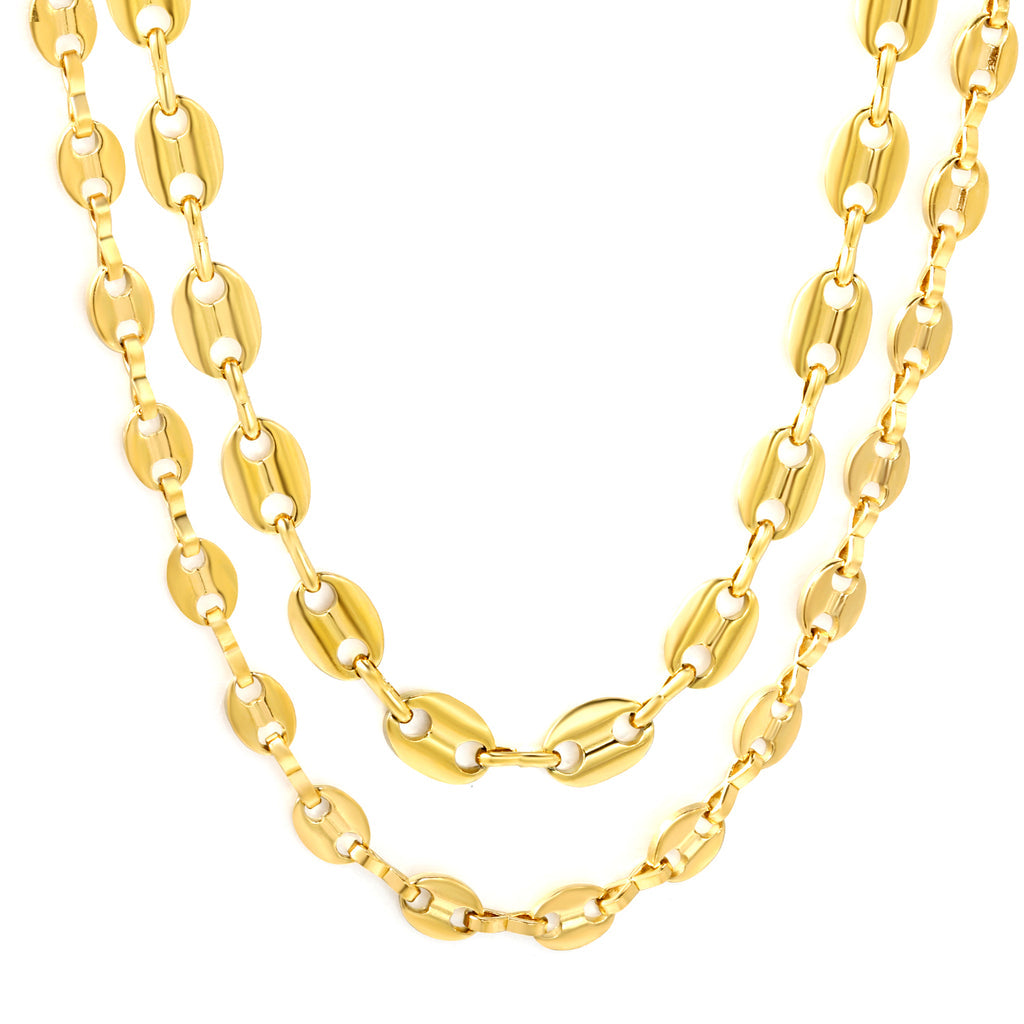 Elevate your style with our sleek Coffee Bean Chain Necklace, featuring 8mm coffee bean-shaped links for a bold and contemporary look. Crafted from premium stainless steel and plated in luxurious 18K Gold or Rose Gold, this 60cm necklace is both eye-catching and versatile. Its hypoallergenic design ensures comfort for sensitive skin, making it perfect for daily wear or special occasions.
